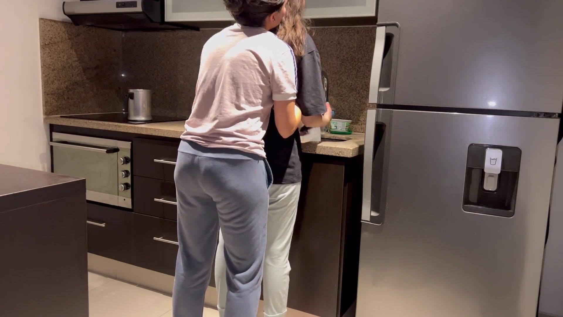 Wife fucked hard with tongue while washing dishes in the kitchen, getting her to cum before her step